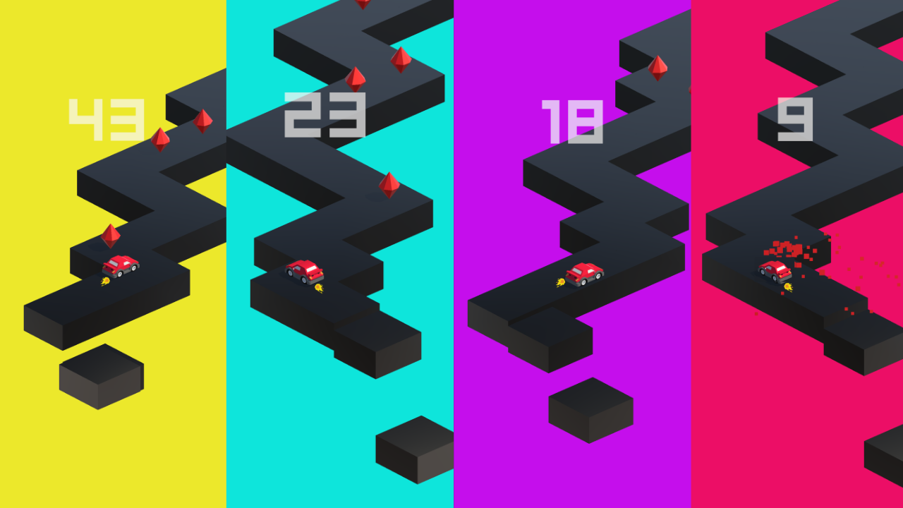 Zig-Zag Racer Game not only offers an exciting solo experience but also includes competitive elements to keep players engaged. It has a changing background color as the score increases, as well as diamonds to collect to score up more quickly